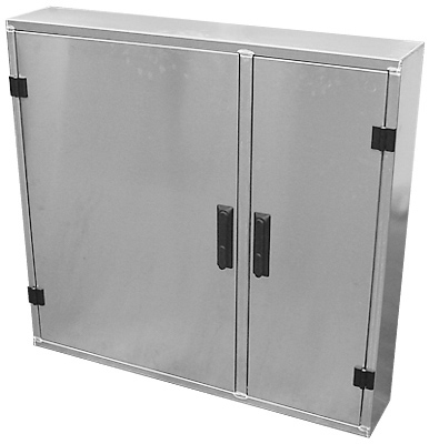 Zweiflügeliger Aluminiumschrank zur Aufbewahrung von Gasflaschen in Wartungsfahrzeugen.