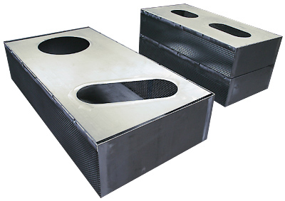 Riemenschutzkästen aus gekantetem Stahlblech, mit eingesetzten Lochblechen, dienen als Schutz vor rotierenden Teilen an Maschinen. Deckel sind verschraubt auf das Gehäuse montiert, um Wartungsarbeiten problemlos durchführen zu können.