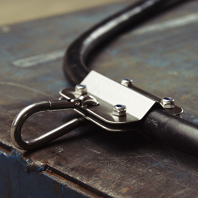 Schlauchhalter aus seewasserbeständigen Edelstahl.Bestehend aus zwei Teilen, die mehrfach gekantet und gestanzt wurden. Die beiden Hälften werden mit vier Schrauben verbunden und am Karabinerhaken aufgehängt.