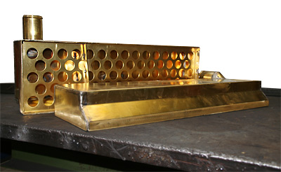 des Sonderkühlers werden aus Messingblech hergestellt. Zur Verstärkung sind in den Wasserkästen gelochte Messingbleche eingesetzt, die einen optimalen Kühlwasserfluss ermöglichen und den Wasserkasten bei steigendem Druck stabilisieren.
