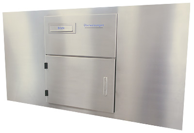 Edelstahlgehäuse für den Einsatz als Nachtschalter in Banken, an der Vorderseite befinden sich schlitze für Überweisungen und ein Briefkasten für Kunden.